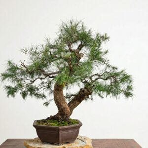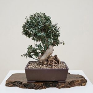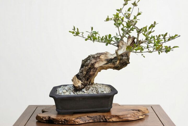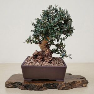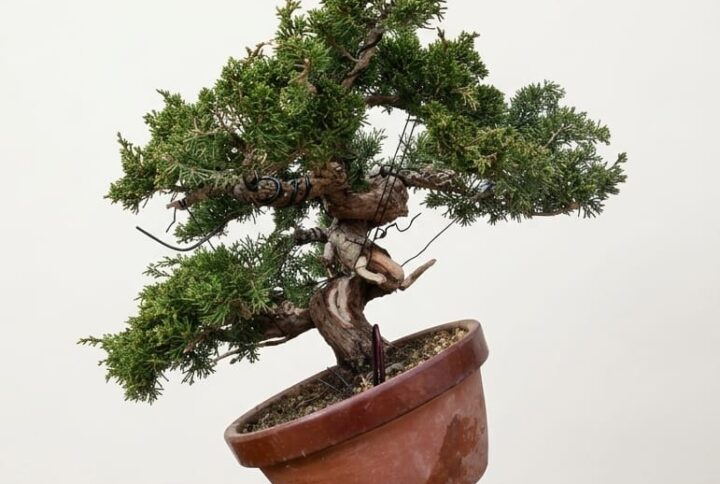 Bonsai of Juniper Kishu in hand-written pot in hand-written pot.